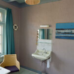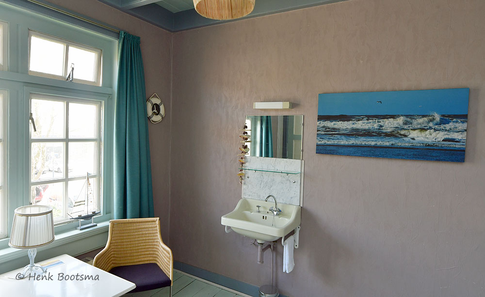 Voorzien van wastafel, zithoekje en uitzicht op de voortuin.